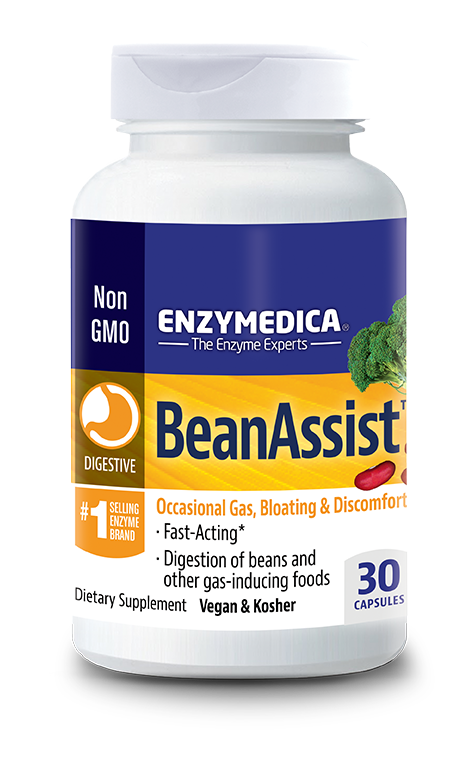 BeanAssist™is a vegetarian enzyme formula that contains alpha galactosidase. The alpha galactosidase enzyme is specifically for digesting carbohydrates found in legumes, grains and vegetables known to cause occasional symptoms of gas and bloating. Research studies have proven alpha galactosidase to be effective for reducing occasional gas related symptoms.*1, 2