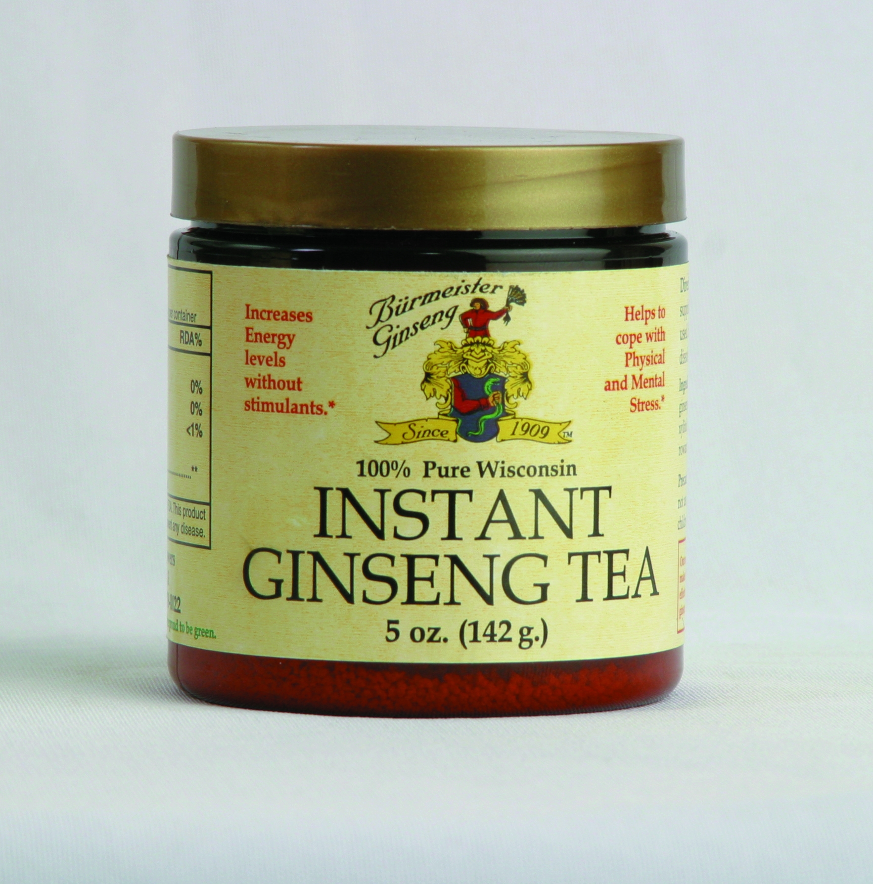 Burmeister Ginseng Instant Tea is reformulated! Wake up your tastebuds with the bracing bitter bite of American ginseng. A great caffeine-free alternative to coffee! Savor its woodsy, bitter- sweet flavor alone or enhance it with honey and a dash of ginger ale. My personal favorite! Our 5.6 oz jar of instant tea delivers 50 servings per jar. Enjoy a bolder, stronger ginseng flavor that delivers a whopping 500 mg of 20% ginsenoside extract per serving! Burmeister brings to the market a quality instant ginseng tea that quickly dissolves in water, hot or cold.