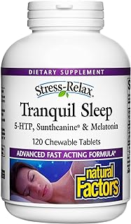 Stress-Relax Tranquil Sleep Chewable from Natural Factors is an advanced blend of 3 natural ingredients to support restful sleep. Formulated with 200 mg of Suntheanine L-Theanine to help ease the mind, 30 mg of sleep-supporting 5-HTP and 3 mg of melatonin to promote a healthy sleep cycle. Our delicious, tropical flavored tablets help you drift off faster, sleep well and wake up feeling refreshed and rejuvenated. Stress-Relax Tranquil Sleep is a drug-free, non-habit-forming supplement designed to promote every stage of sleep.
